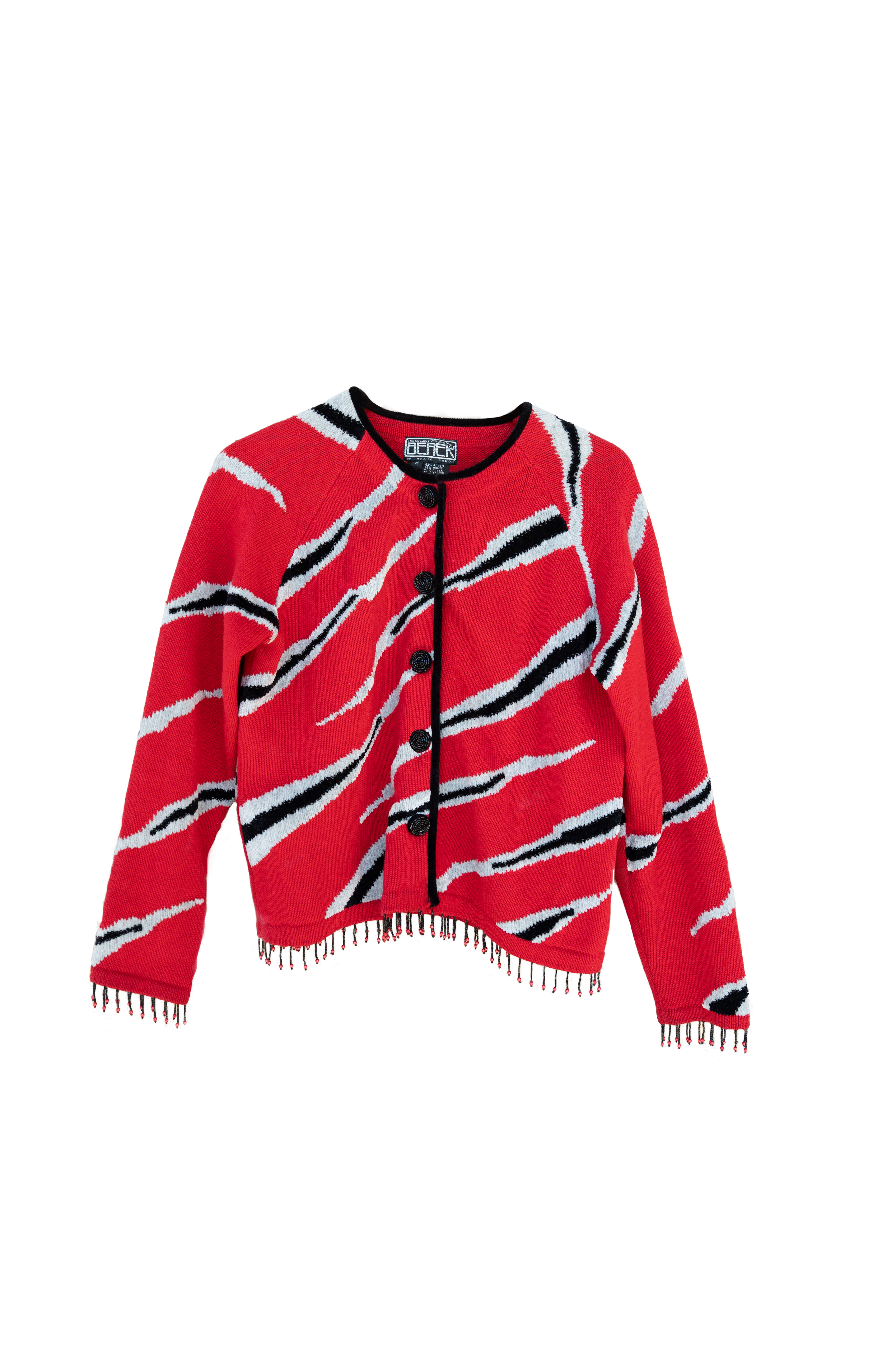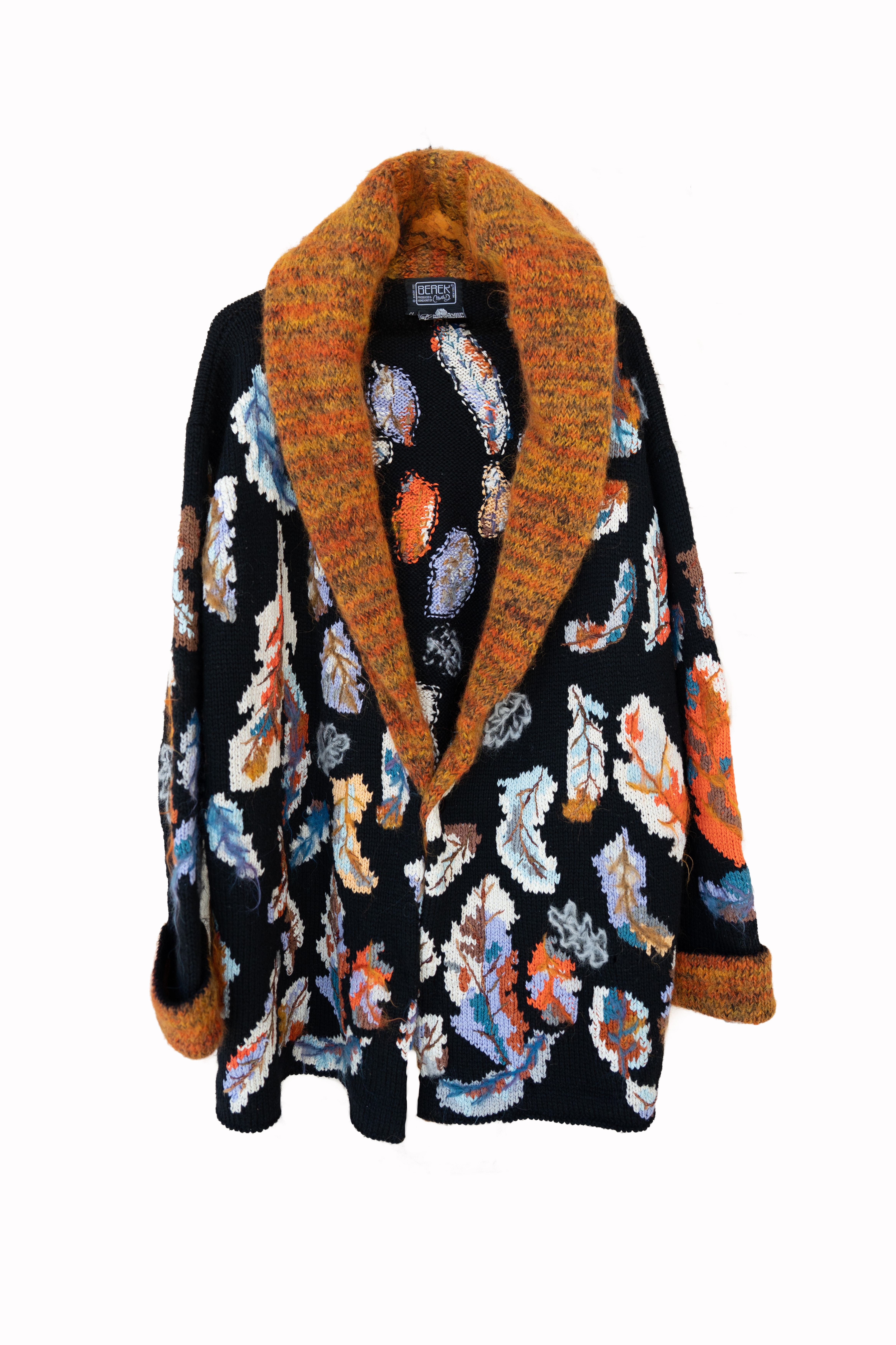 1989 Playful Handknit Button Down Cardigan by Berek. Please note: All pieces are vintage and will show signs of wear. Tag size Medium, Pit to Pit 22", Shoulder to Shoulder 19", Length 24".