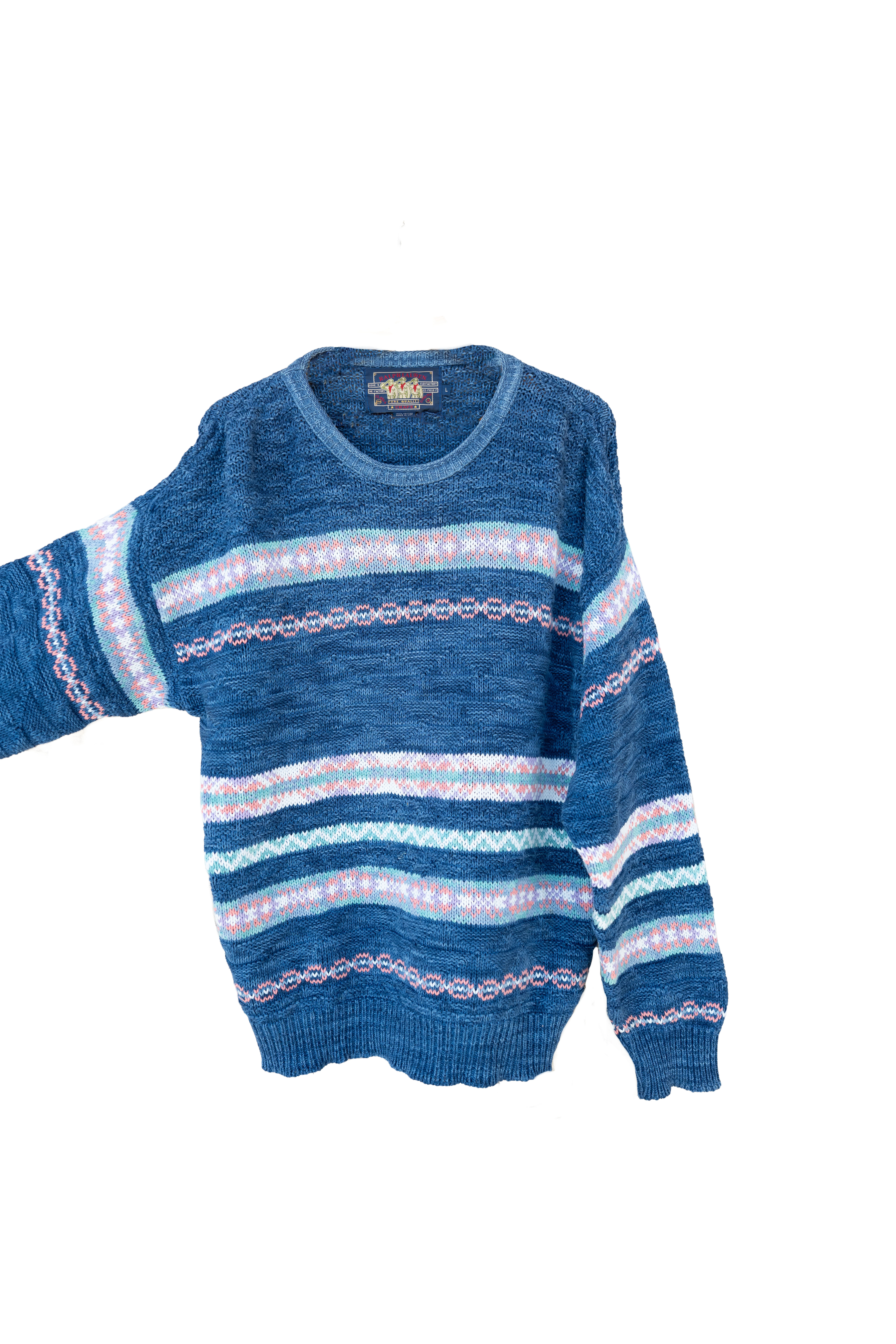 Iconic Diane Fried Knit concept featuring an intricate landscape set against rich blue backdrop, creating a storybook-like atmosphere. Composition 34% mohair, 25 % Rayon, 20 % acrylic, 19 % wool. Please note: All pieces are vintage and will show signs of wear. Pit to Pit 20", Length 25".
