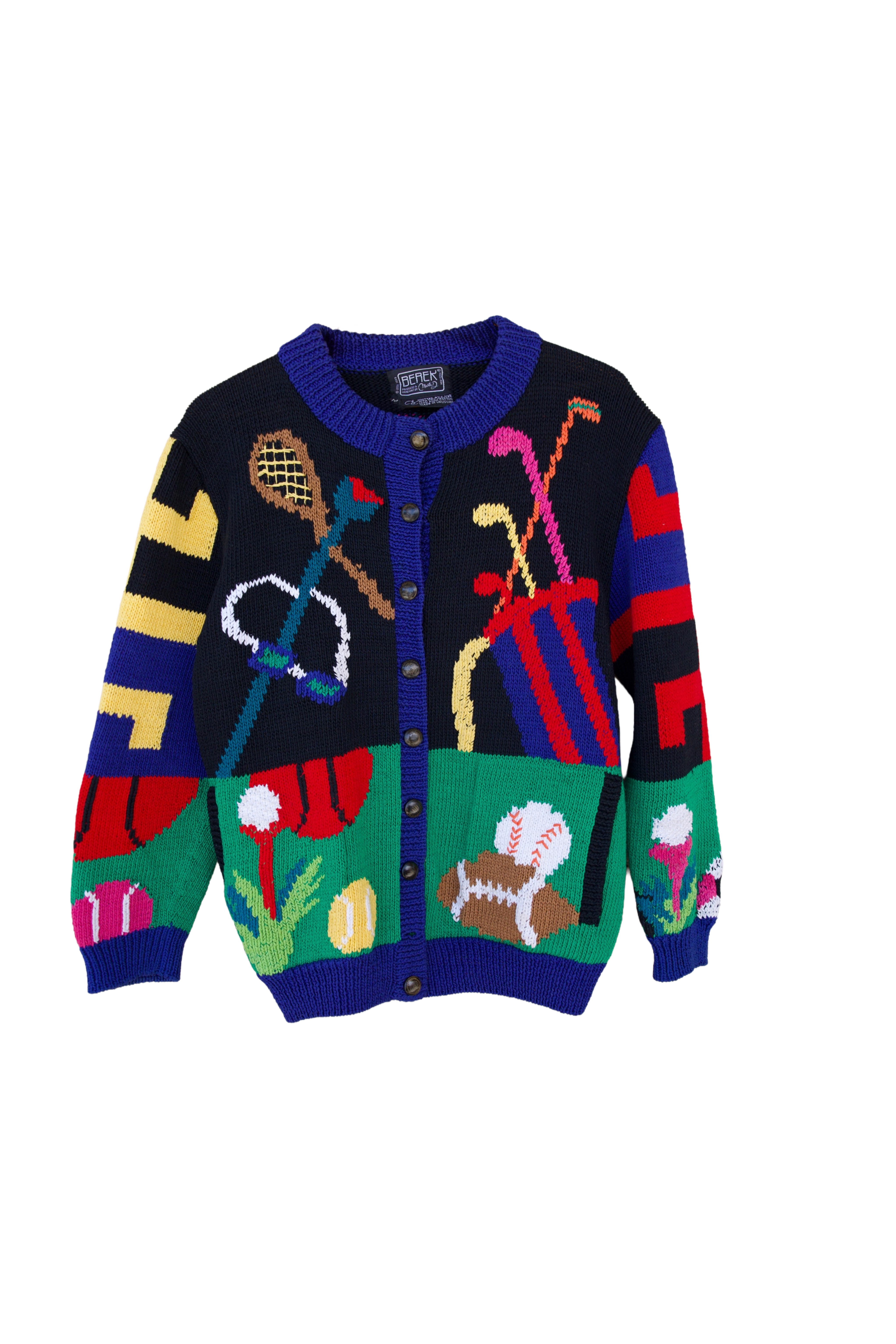 Vintage Cardigan from Berek by Takako Sakon with bold graphic contrast. Deep red base and structured trim along neckline and button line. Elevated by black velvet beaded buttons. Dynamic black and white diagonal zebra pattern. The Hem is detailed with red and black beadwork. Please note: All pieces are vintage and will show signs of wear. Tag size Medium, Pit to Pit 20", Length 21".